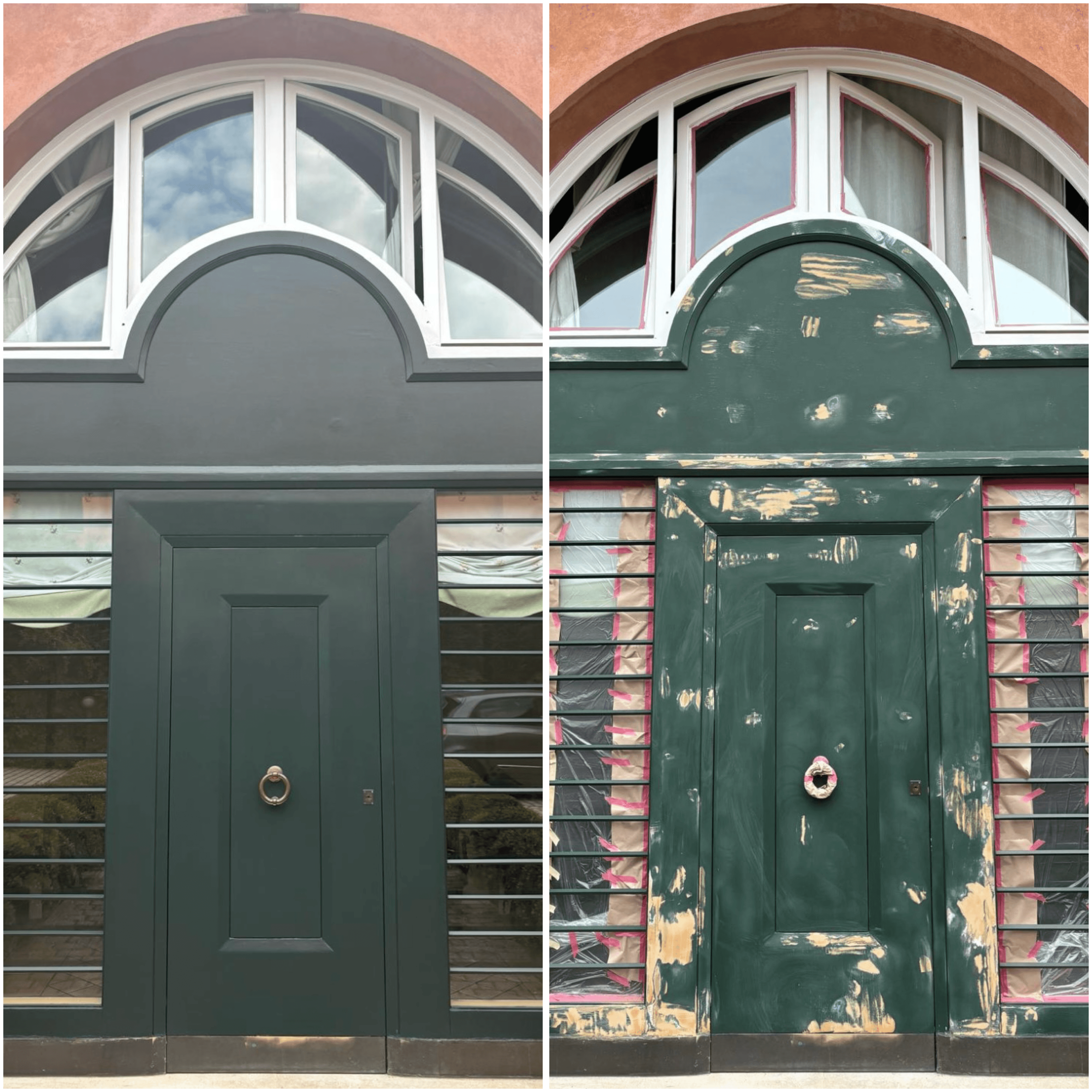 Prima e dopo stuccatura, levigatura e verniciatura portone in legno
